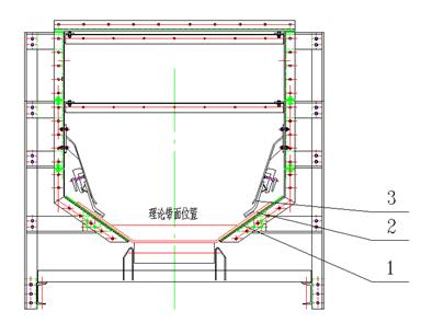 图一中3处为内侧密封防尘裙板,该裙板采用橡胶硫化聚氨酯制作成型,以足够弹性和韧性贴紧皮带内侧,以达到face-face密封效果。橡胶具有足够弹性,能够保证裙板和皮带之间形成面接触,而聚氨酯具有足够的耐磨性和自润滑性,保证裙板较长的使用寿命。采用上述密封结构,彻底杜绝粉尘从导料槽两侧逸出的问题。3处裙边夹持器所在位置为耐磨钢板,能够有效防止物料飞溅。此种“内外夹击”的结构形式,能够有效防止皮带跑偏和振动,较少皮带机维护时间,保证皮带机正常出力。
