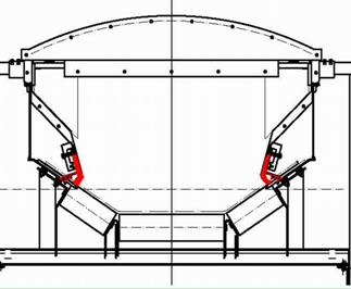 皮带机带宽小、输送量较小时,可采用上述全密封方案。若皮带机规格参数较大时,单纯使用高分子耐磨板,会出现皮带摩擦发热,产生安全隐患,故推出大皮带“复合式密封导料槽”,保留部分侧托辊,与高分子聚乙烯耐磨板形成复合式密封机构,既保证密封效果,又能有效减少摩擦,防止皮带升温,结构图二所示。
