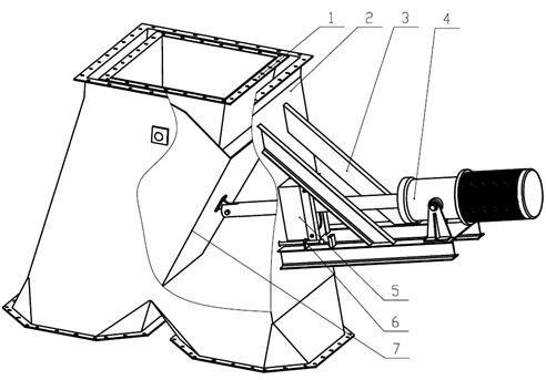 1- 进料口 2- 三通 3-电动支座 4-电动推杆 5-密封组件 6- 限位装置 7- 调向筒